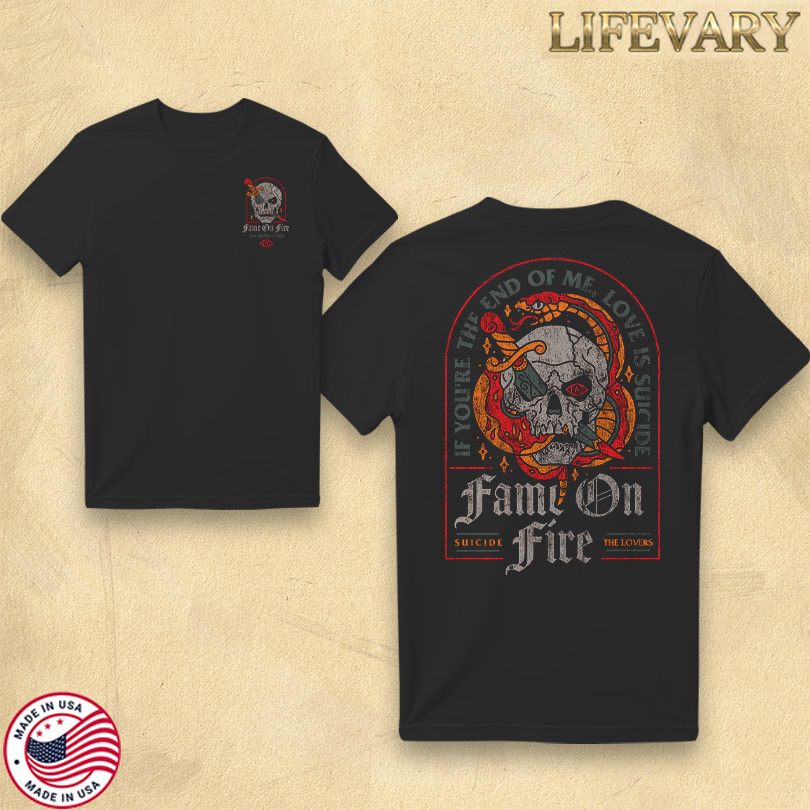 fame on fire tee, love is suicide shirt, graphic print t-shirt, edgy cotton tee, unique style fashion, bold statement top, concert outfit idea, expressive graphic tee, attitude t-shirt design, comfort and style shirt, high-quality fabric t-shirt, fearless spirit top, individuality fashion piece, trendy graphic tee, music-inspired clothing, rebellious tee design, rock band merchandise, alternative style shirt, casual streetwear top