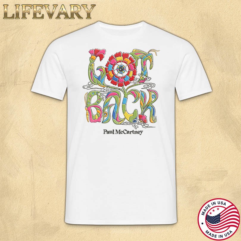 paul mccartney store, got back 2025, floral tour tee, vintage-inspired t-shirt, colorful floral design, 2025 tour, high-quality fabric, comfort and style, paul mccartney fan, trendy wardrobe addition, casual outings, music history celebration, unique fashion piece, concert attire, lounge wear, music memorabilia, retro fashion statement, fan merchandise, iconic musician apparel